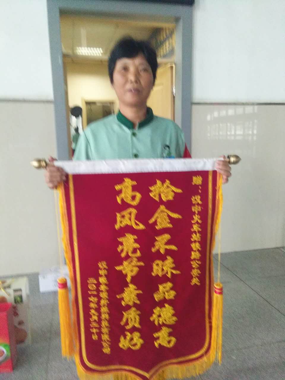 9月23日,失主某先生將一面寫有“拾金不昧品德高,高風(fēng)亮節(jié)素質(zhì)好”字樣的錦旗送給“保潔員”張小艷。